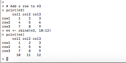 From the above output, it is clear that the 4th row is added but the name for the row is missing. We need to add a new value to the Vector rownames that we defined at “Naming a Matrix“.