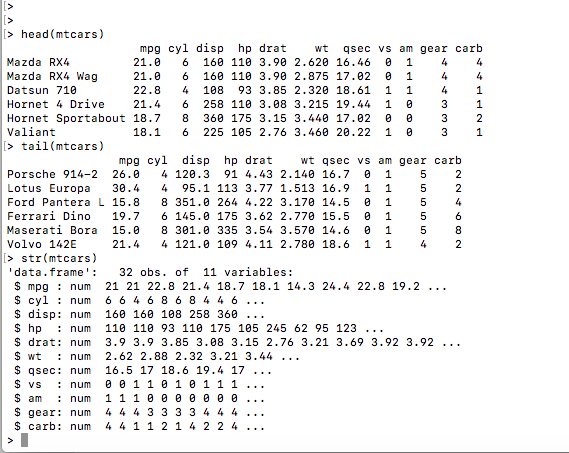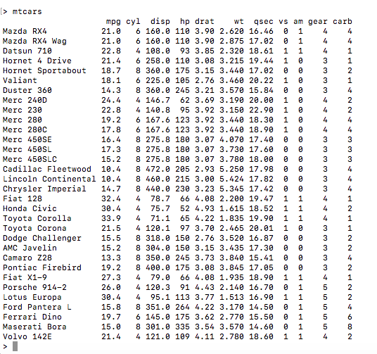 While working with Data Frames, we may need to work with an extremely large data set. For example, we can use the built-in data frame mtcars.