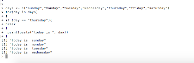 In this scenario, R prints the days till “Wednesday, skips “Thursday” and then continue the iteration printing the rest of the elements of the Vector.