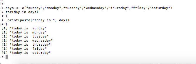 - The variable is “day” and the for loop will execute the expression for each day in the Vector “days”