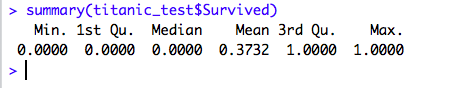 If we check the summary of our prediction, it looks like the Minimum value is 0 and the Max value is 1. That means we are calculating the probability of survival of a passenger and the value is between 0 and 1. In this example, 156 passengers did survive and 262 passengers did not.