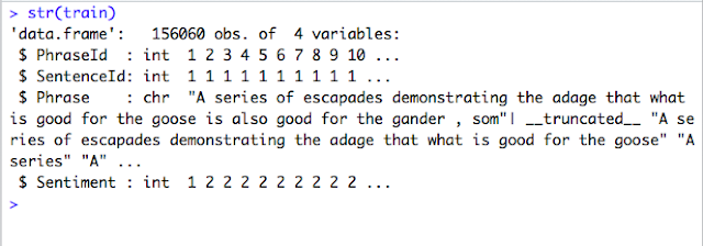First, I have loaded the Training file alone. The .tsv datafile is loaded with read.delim. There are total of 156060 observations and 4 variables in the training data file.