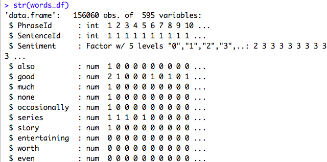 2. We are converting the list object created above into a Data Frame of 156060 observations and 592 variables where all those words that are identified as “mostly used” are considered as new features. We will use these features for building a Model later.