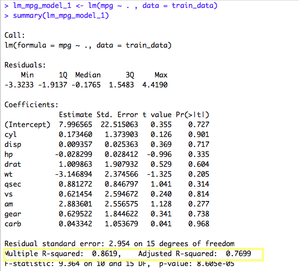 As per our Model, the Predicted mpg value for Mazda RX4 Wag is 22.30340 and the actual value in our Test dataset is 21.0 which is not exact but almost accurate. To test the accuracy of our Linear Regression Model, we can calculate the R-Squared value on our Test Data. The formula is